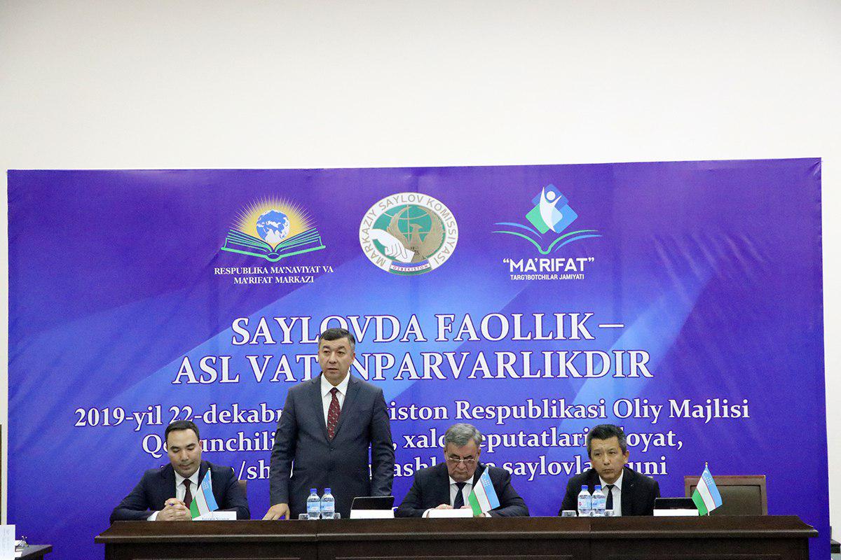 1 ноября 2019 года, в Ташкенте был проведен семинар, организованный Республиканским центром духовности и просветительства, обществом пропагандистов "Маърифат" совместно с Центральной избирательной комиссией, на тему "Активность в выборах истинный патриотизм".
